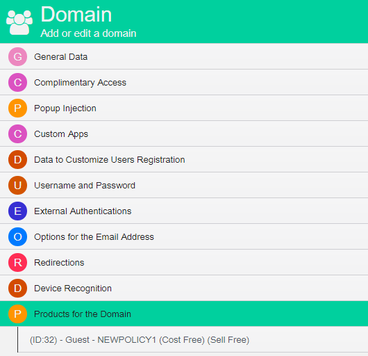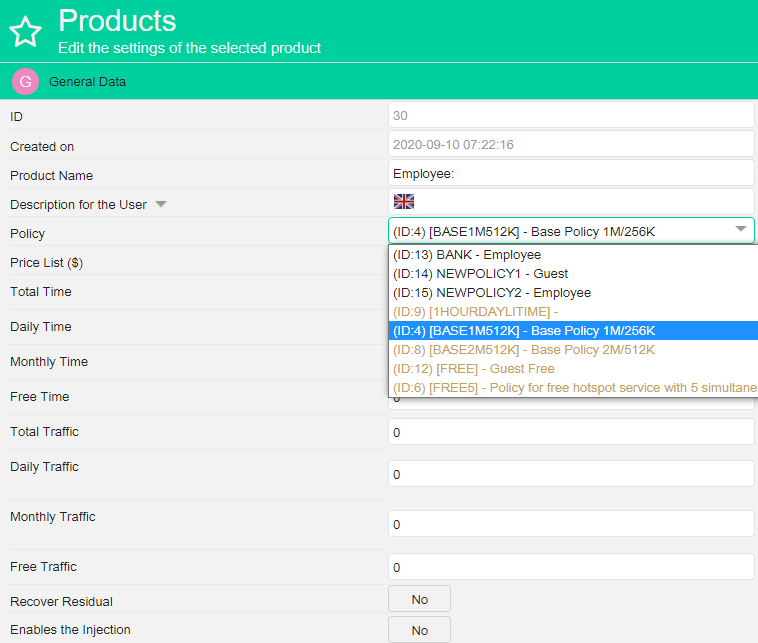 In the products, you can define the policy of the product, the price with that the Wi5stars owner wants to sell the product to reseller/manager, and the parameters such as total/daily/monthly time/traffic credit.