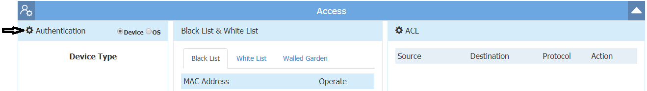 Now you need to configure the parameters for the Captive Portal. In the Web Management, scroll down and expand the Access session by clicking it or using its arrow on the right.