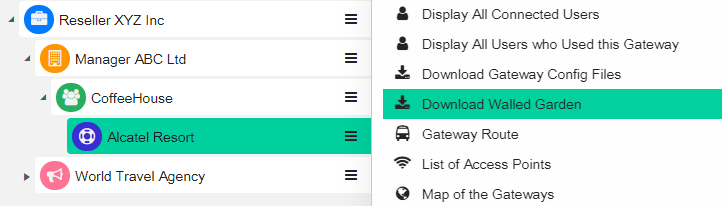 To know the accurate and relevant Walled Garden, you need to add one by one, access your Wi5stars platform and click the contextual dropdown menu of your gateway. Select Download Walled Garden to get a .txt file with your accurate walled garden list as shown Figure Download Walled Garden.