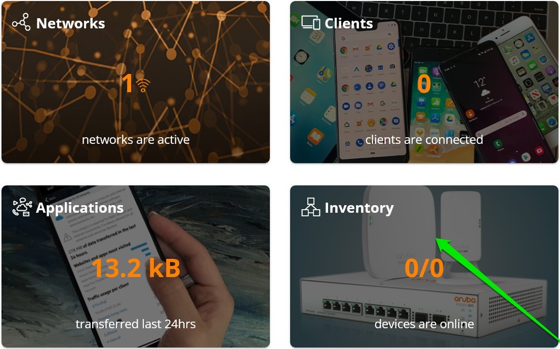 Once logged in, you should see the Aruba Instant On user interface, with the following modules available: