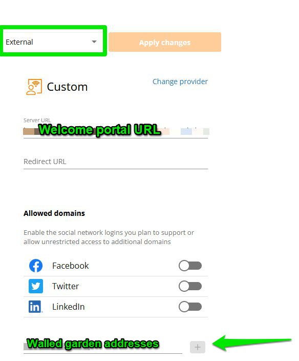 Now you need to configure the Walled Garden. In the Guest Portal page, under Allowed domains, enable the social networks logins you plan to support (if you plan to support any).