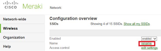 Select the Wireless menu. Under the Configuration section, click SSIDs. If you need it, edit the Network name by clicking on “rename”. Otherwise, follow the next step.