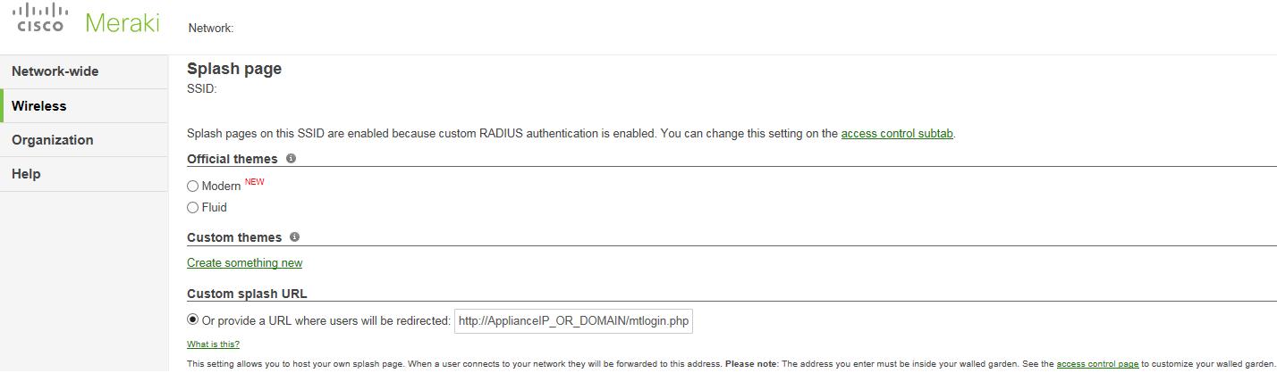 Now you need to configure Radius for Splash Page and Radius accounting. To be able to add an accounting Radius server you need to contact Meraki support asking them to enable this feature.