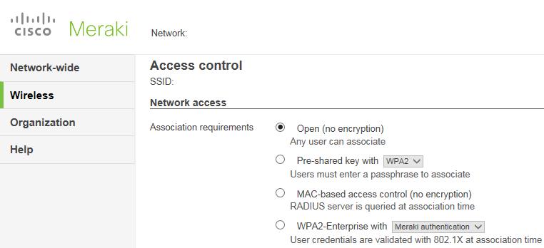 Under Network access section, tick “Open (no encryption)” in Association requirements: