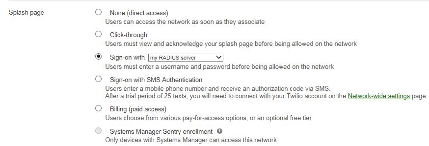 Tick “Sign-on with my Radius server” in the Splash page field.