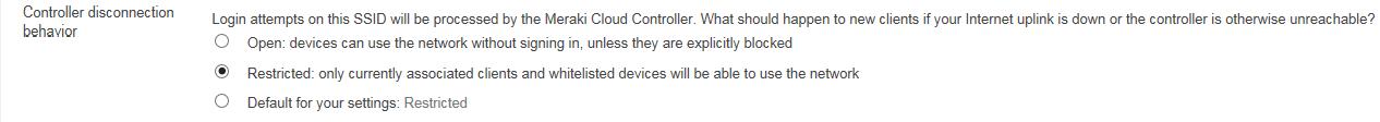 In the Controller disconnection behavior field, tick “Restricted: only currently associated clients and whitelisted will be able to use the network”.