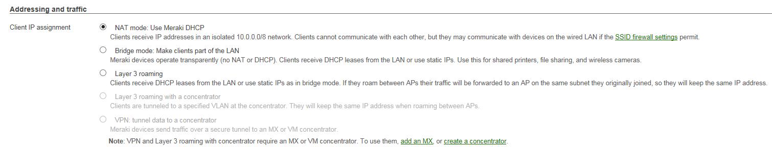 In the Client IP assignment field, tick “NAT mode: Use Meraki DHPC”.