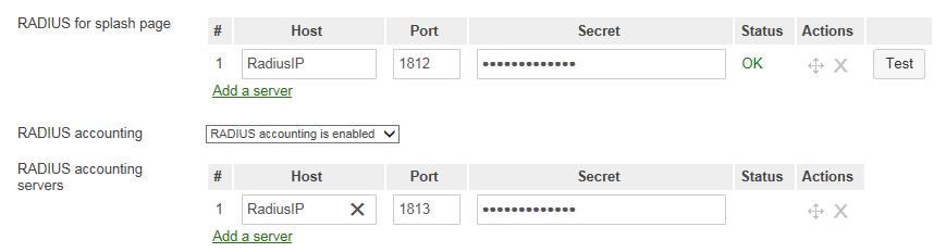 Click Add a server, in the Radius for splash page section, and enter the following details: