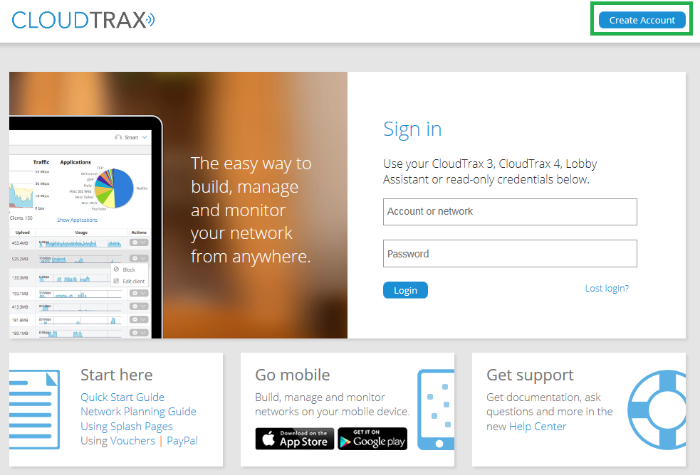 Type https://ct4.cloudtrax.com/login and click the Create Account button on the top-right corner of the page.
