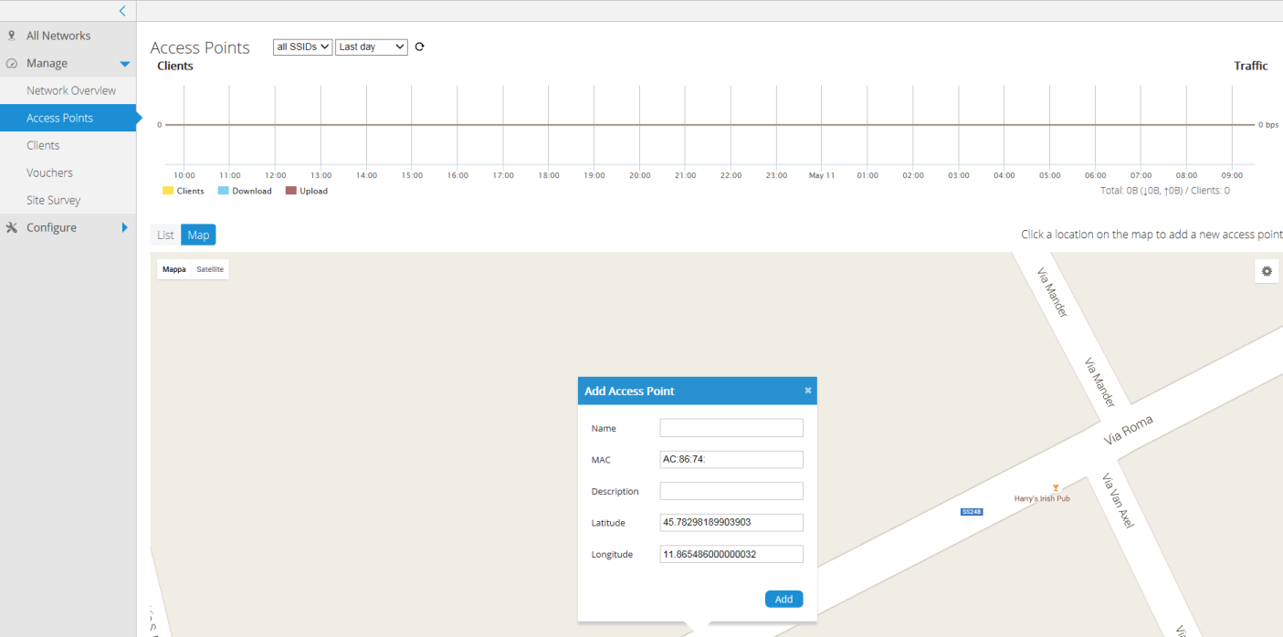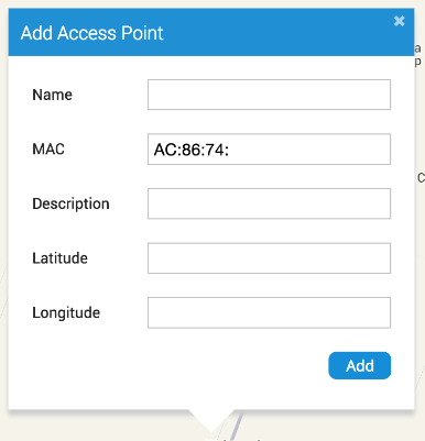 Now you can add the access points that you want to include in the network. Adding them to CloudTrax will allow you to manage and monitor the access points from anywhere. A Google map, centered on the address you entered when you created the network, will show a popup to enter your first access point.