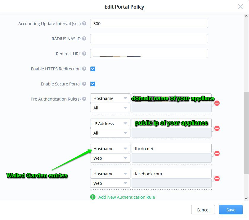 To configure the walled garden, continue from the page just described in the previous steps and enter the list of the walled garden you can download from your gateway appliance.