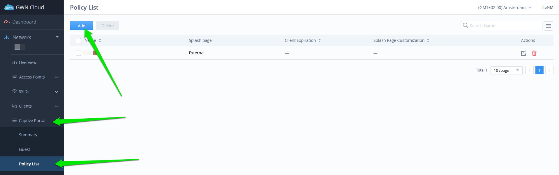 From the User Interface, click on Captive Portal > Policy List and select Add