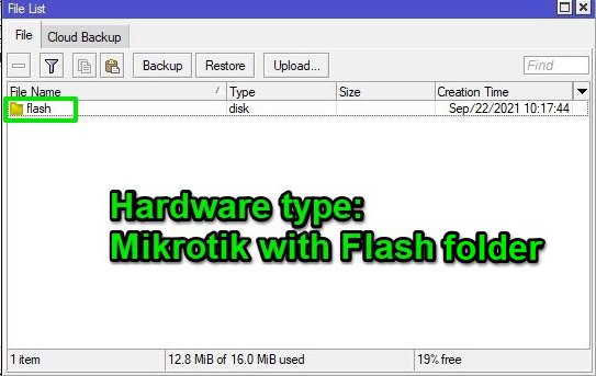 Check if your MikroTik has the Flash folder. Log in with Winbox, select Files.The File List appears, and please check whether it contains a folder named Flash.