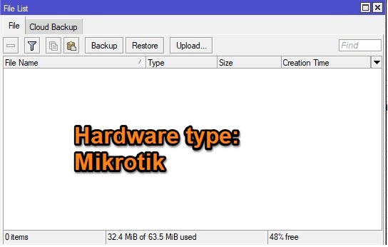 If you are using a MikroTik device that is already running in a production network, we recommend creating a backup of your current configuration. Go to Files > Backup, then click to back up your current configs to the file. Optionally, drag and drop the new backup file to your desktop to save it locally.