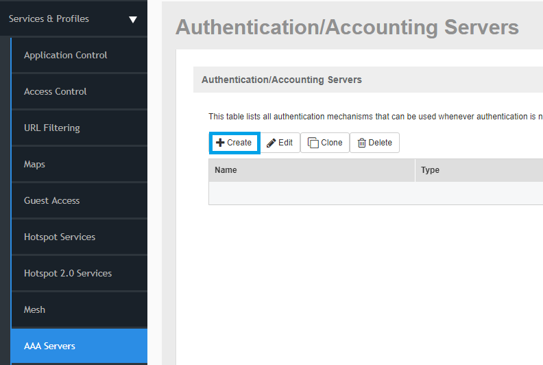Click the Services & Profiles tab on the left, then click AAA Servers. Click +Create and specify a name