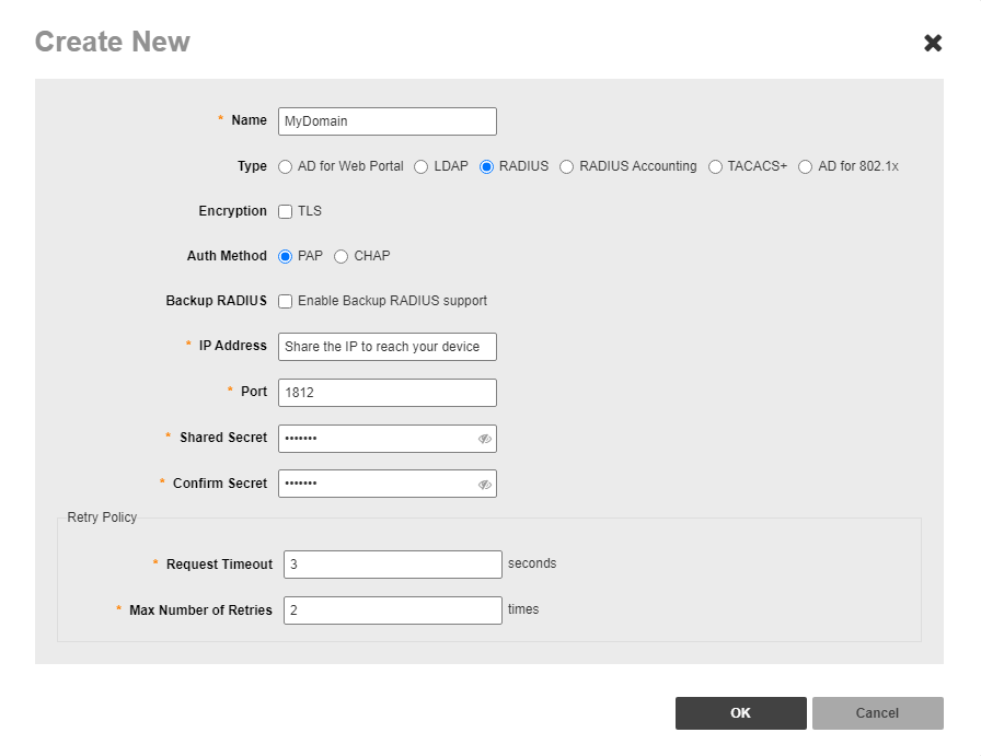 In the Authentication Server field select the radius name created in the Configuring the Radius Server chapter
