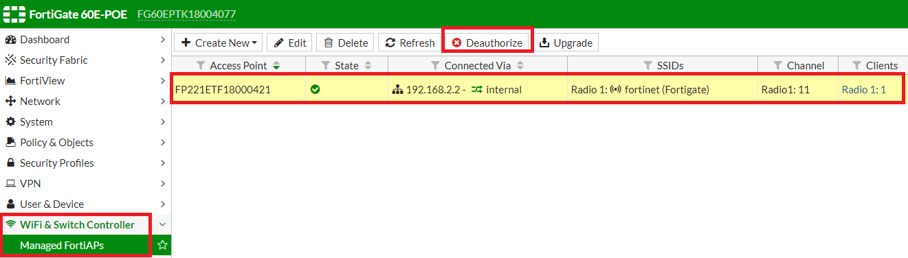 A list of managed or unmanaged FortiAPs will appear. Select your AP and click the Authorize button at the top to allow FortiGate to manage it.