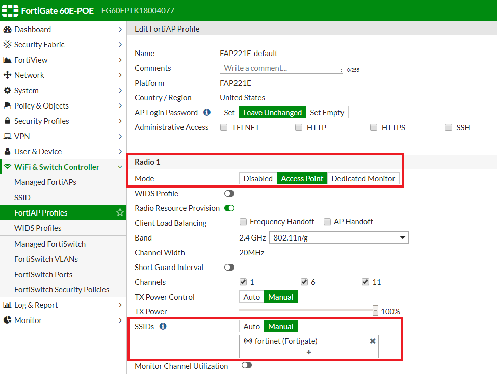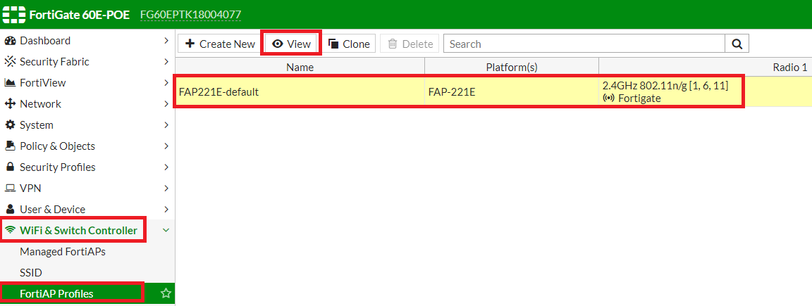 From the WiFi & Switch Controller menu on the left, click FortiAP Profiles.