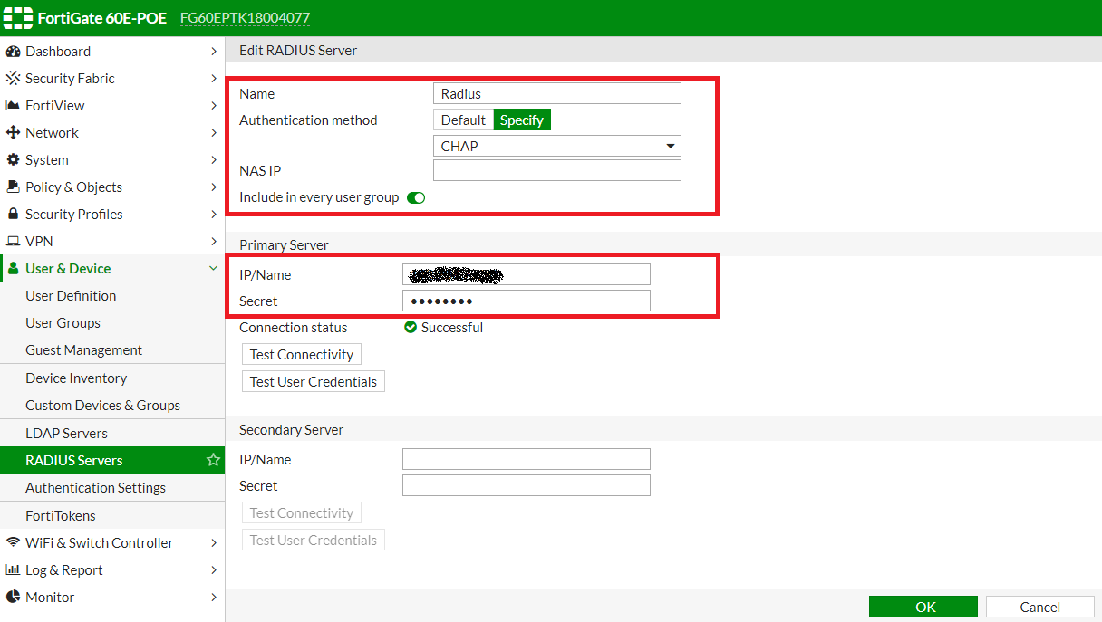 The IP of the primary Radius server is the IP address of your Wi5stars while the secret is the one you set in your Wi5stars configuration.