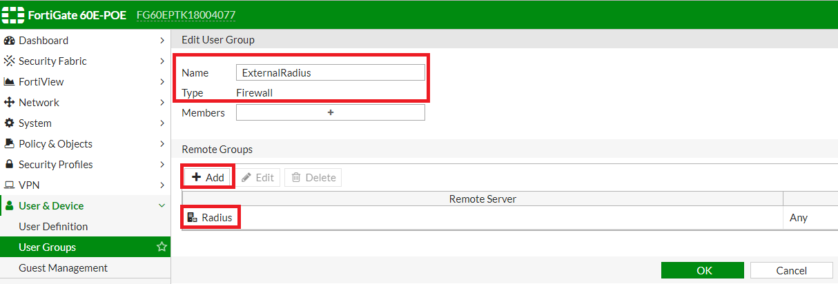 In the Remote Groups section, select the Radius server you have just created in Configuring a Radius Server.