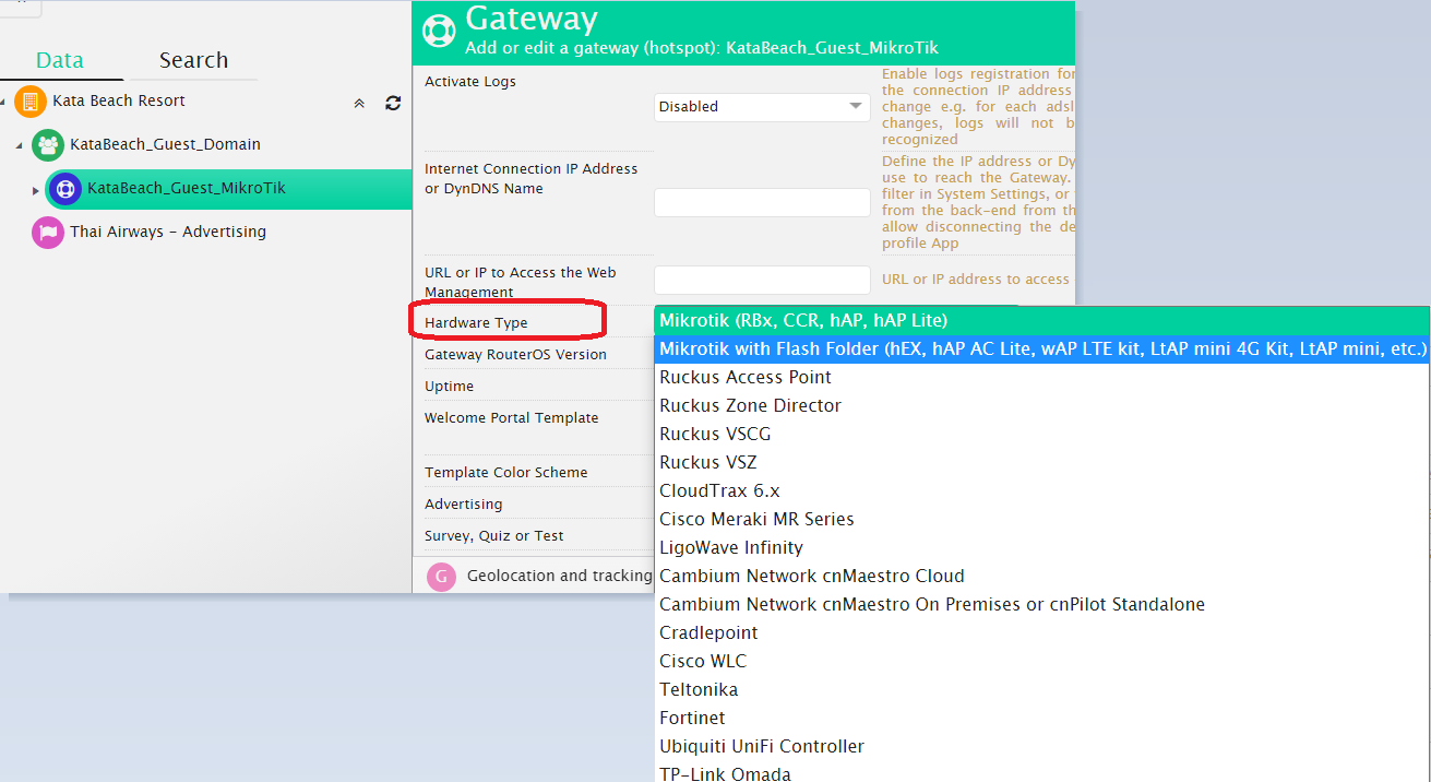 Now inside Wi5stars, select your Gateway, click the dropdown menu, choose Edit. Expand the General Data section, in the Hardware Type field, choose whether MikroTik or MiktroTik with flash (hEX, hAP AC Lite, etc…).