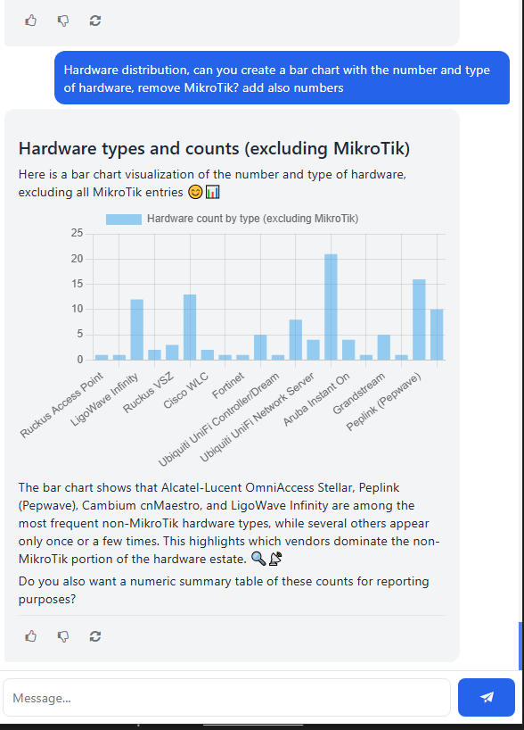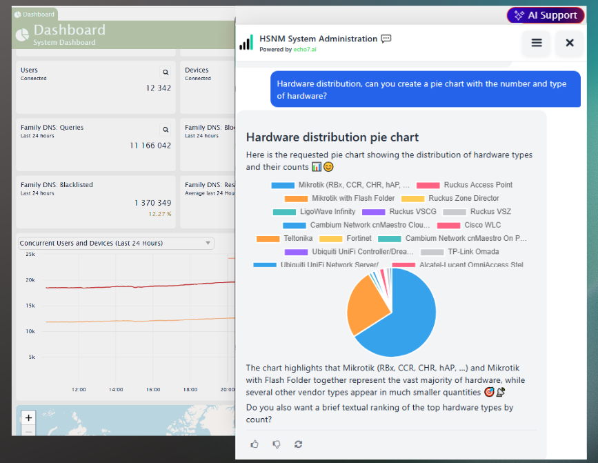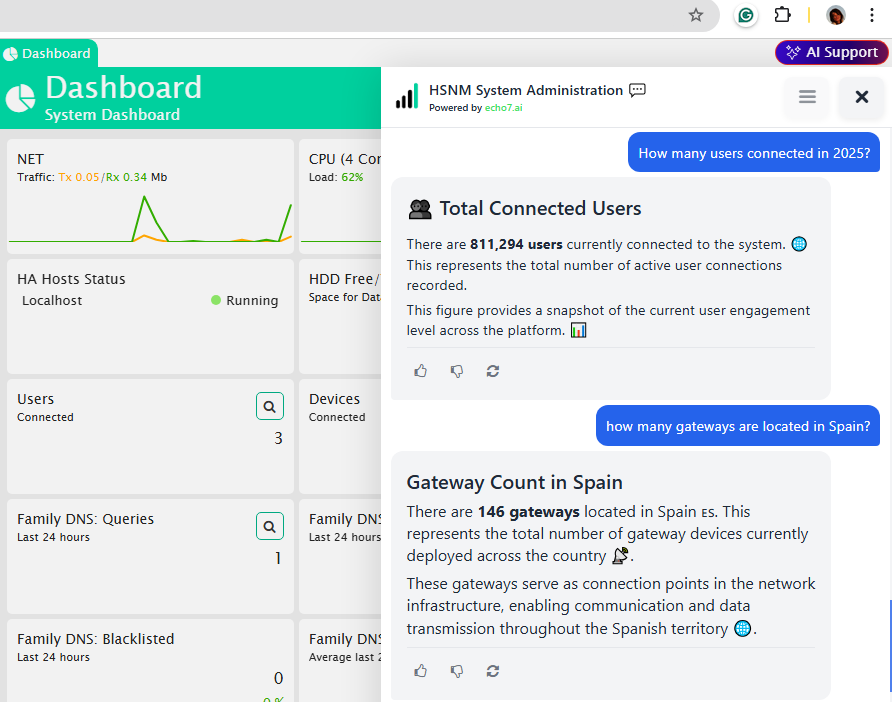 Integration with Echo7 Company Brain: an AI assistant that interacts with your data, queries available information, and delivers structured answers, tables, and real-time charts.