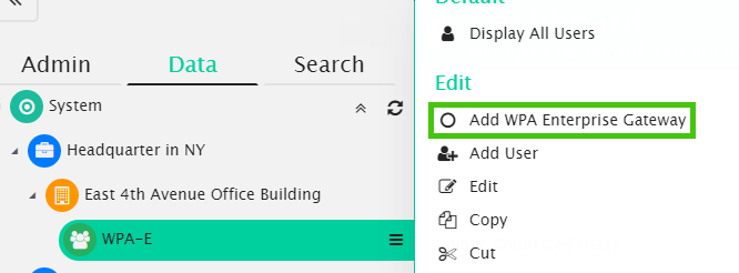 From the dropdown menu of the domain, now you can add your WPA-E gateway by clicking Add WPA Enterprise Gateway.